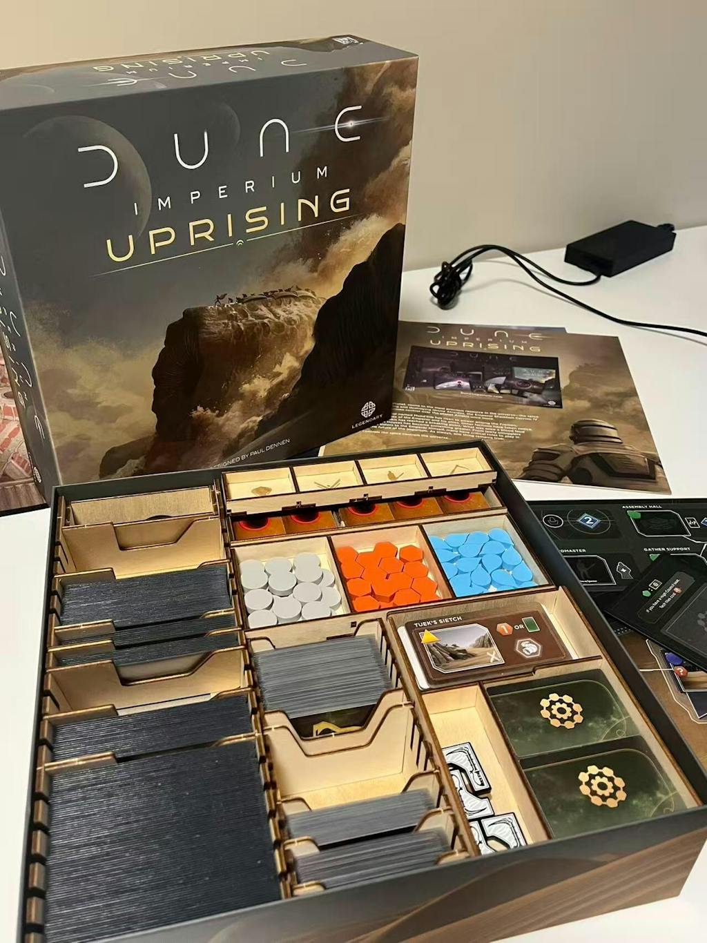 This organizer helps you to expand your Dune Imperium universe and stores the game and expansion in the Uprising box together. Support premium sleeved cards (we tested with SWAN and Gamegenic) and reduces your setup time down to 2-3minutes.