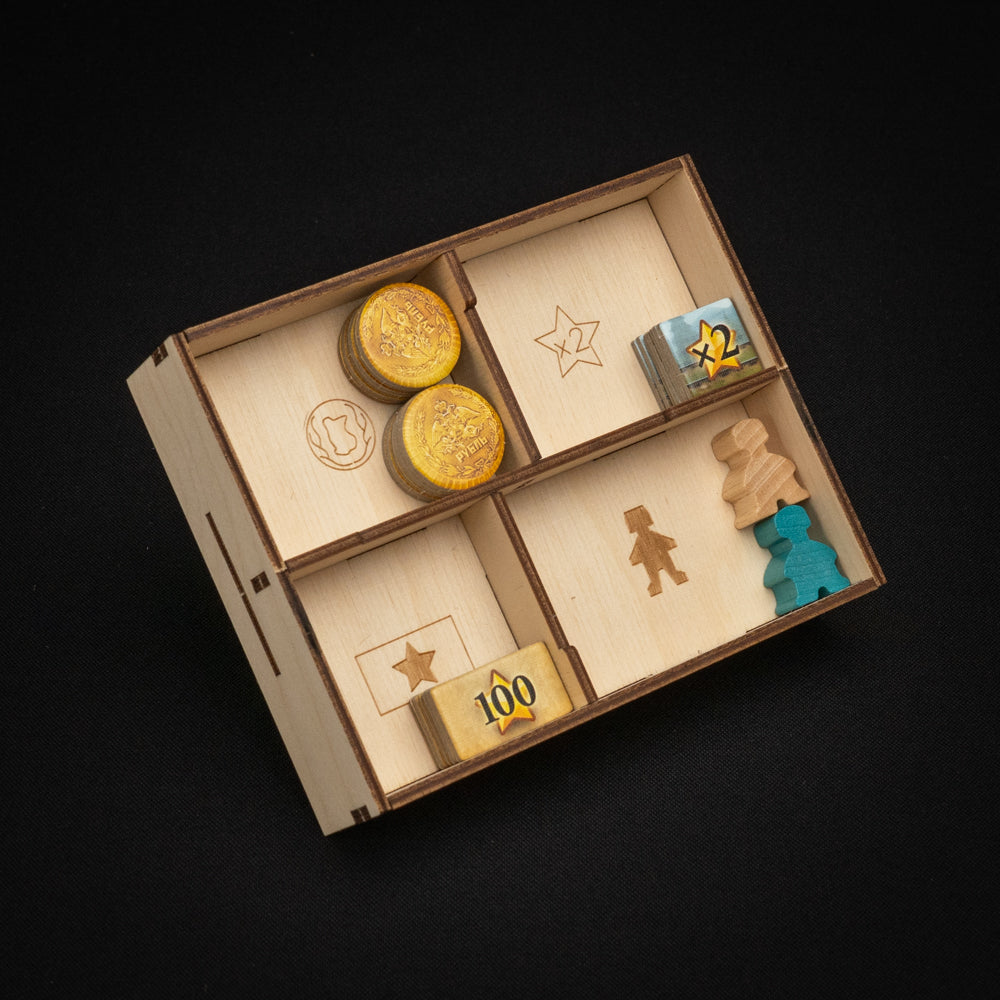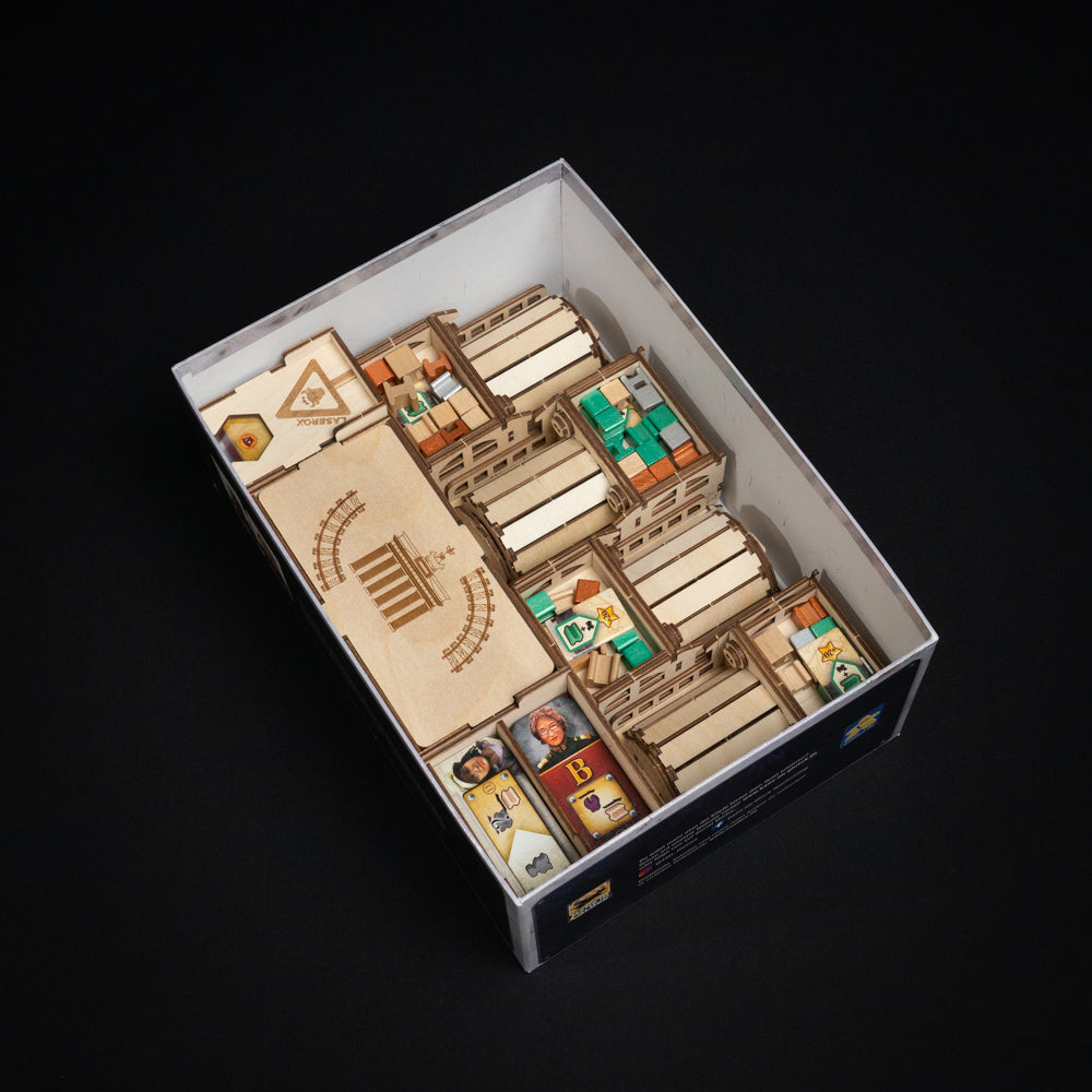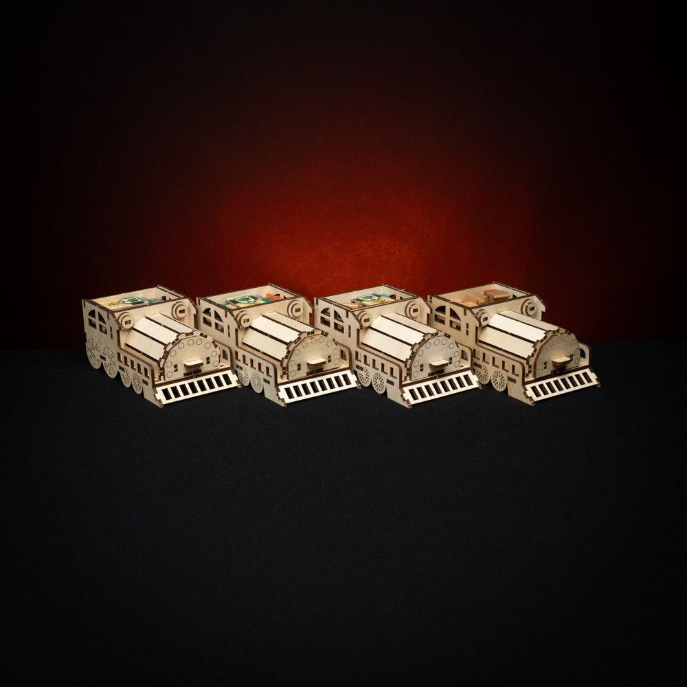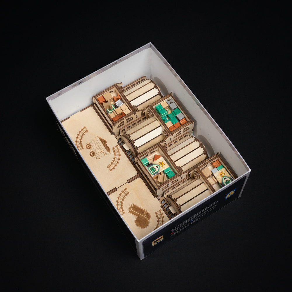 The paths leading to victory are many, and you have to be skilled at assessing the initial situation to make the most advantageous choices throughout the game. Although the original insert in the game box is quite good and functional, we could not resist the temptation to spice it up a bit to get rid of the plastic ziplock bags, and of course, to speed up the setup and cleanup time. We’ve made neat, engraved boxes for the general game components and 4 unique, locomotive-shaped containers for individual player components.