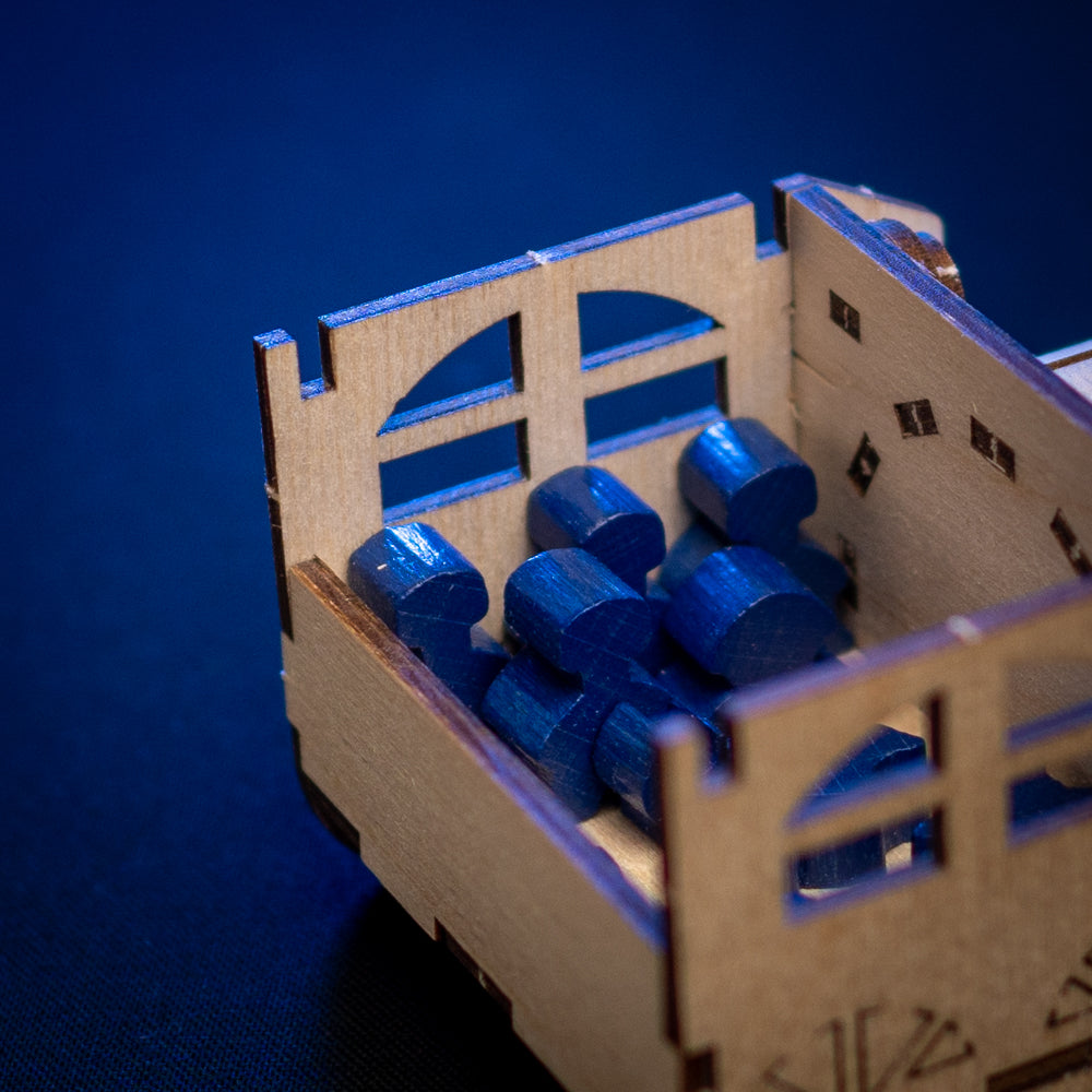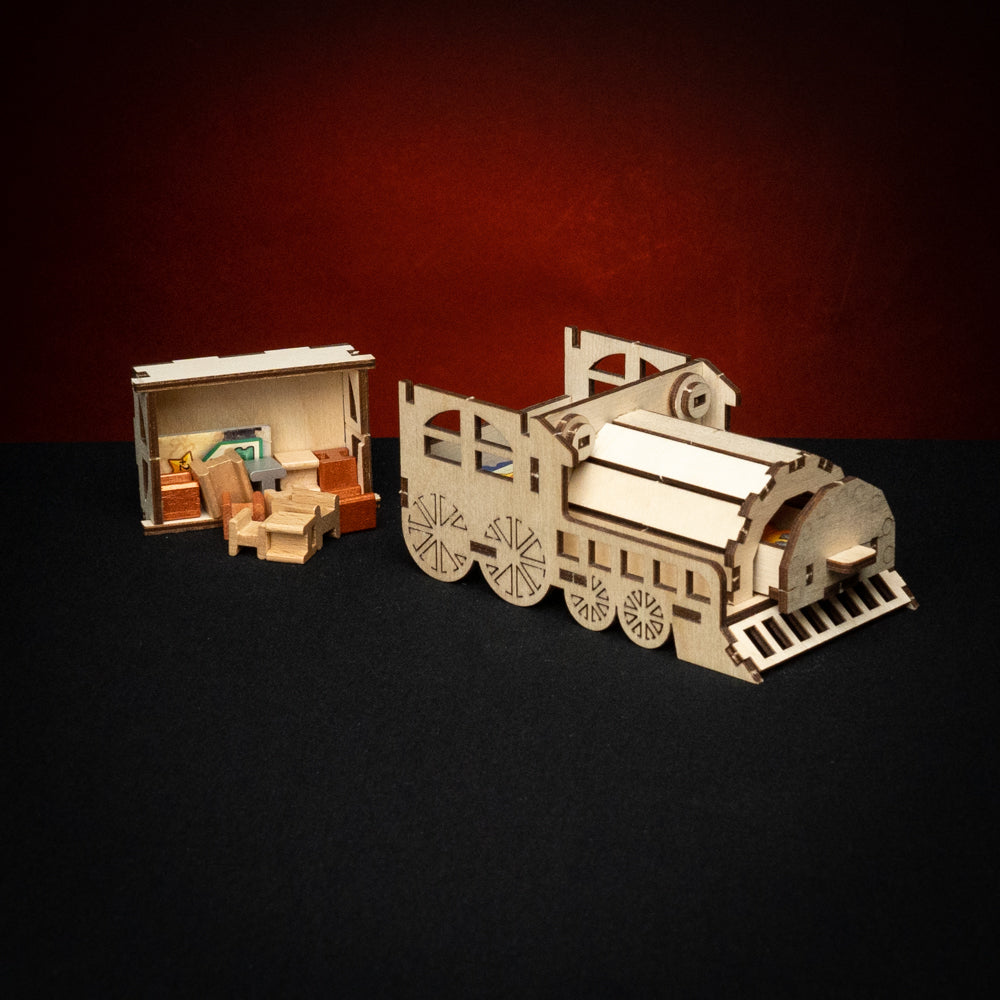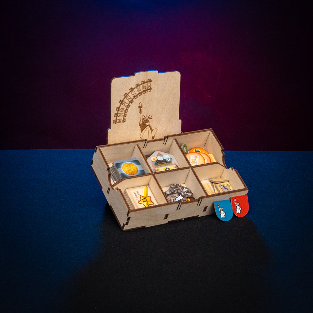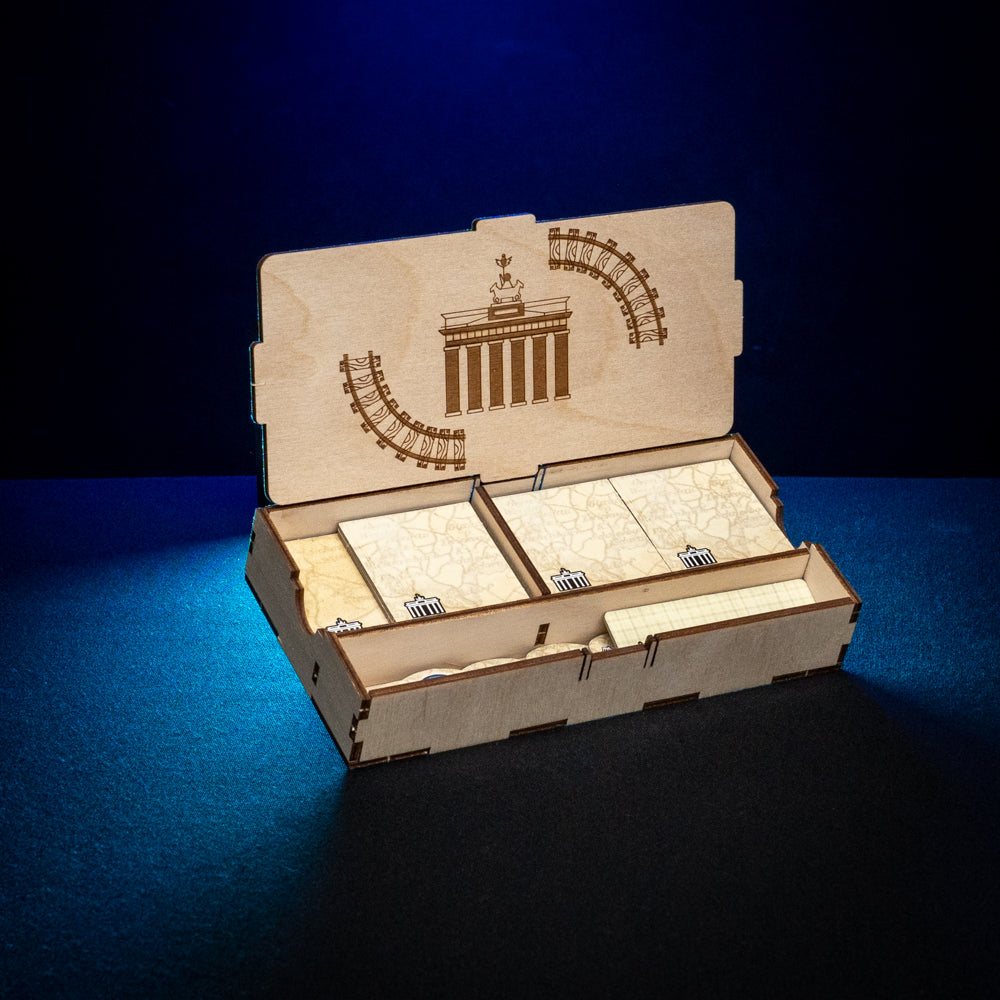 The paths leading to victory are many, and you have to be skilled at assessing the initial situation to make the most advantageous choices throughout the game. Although the original insert in the game box is quite good and functional, we could not resist the temptation to spice it up a bit to get rid of the plastic ziplock bags, and of course, to speed up the setup and cleanup time. We’ve made neat, engraved boxes for the general game components and 4 unique, locomotive-shaped containers for individual player components.